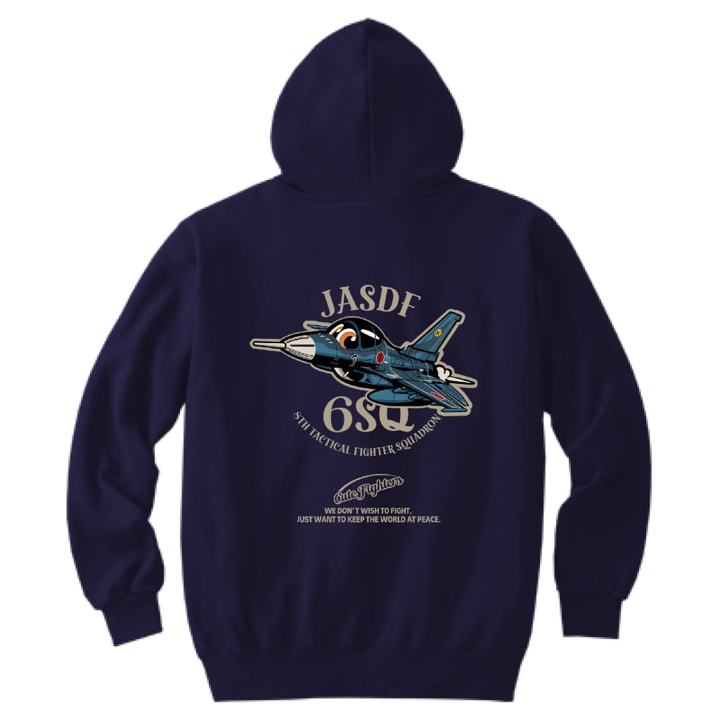 戦闘機をカッコ可愛く擬人化したイラストがプリントされたジップアップパーカー。