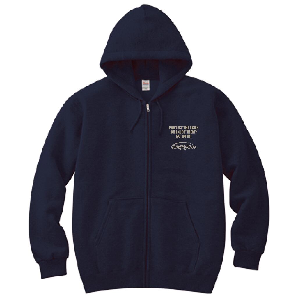 戦闘機をカッコ可愛く擬人化したイラストがプリントされたジップアップパーカー。
