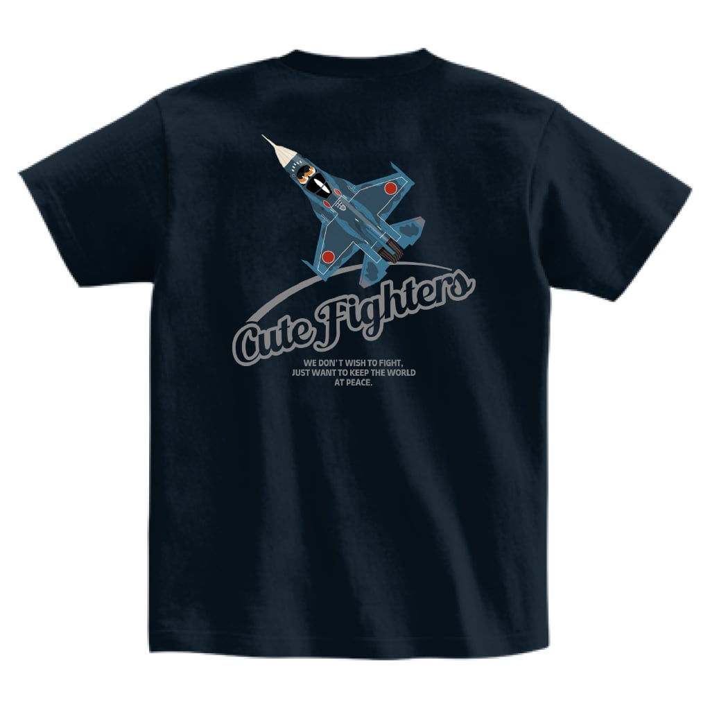 戦闘機をカッコ可愛く擬人化したイラストがプリントされたヘビーウェイトTシャツ。