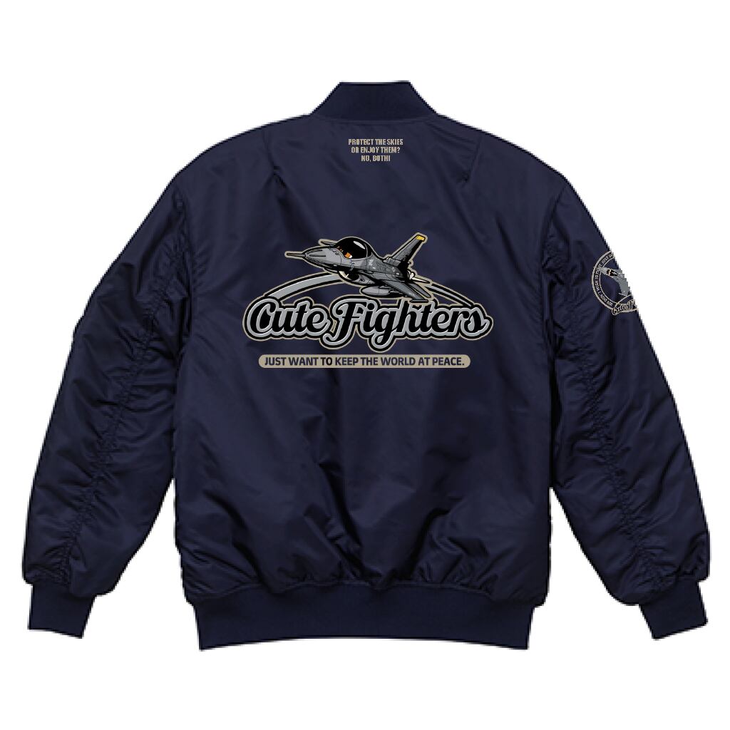 戦闘機をカッコ可愛く擬人化したイラストがプリントされたMA-1タイプのフライトジャケット。